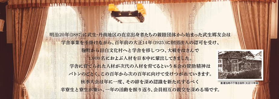 武生郷友会の最も重要な年間行事の一つ、秋季大会の日程と概要が決まりました。今年は、財団法人に認可されて百年目。本会の賛助の理念を再確認する会にしたいと思います。卒寮生の方、ぜひご参加ください。詳しくは、こちらへ。